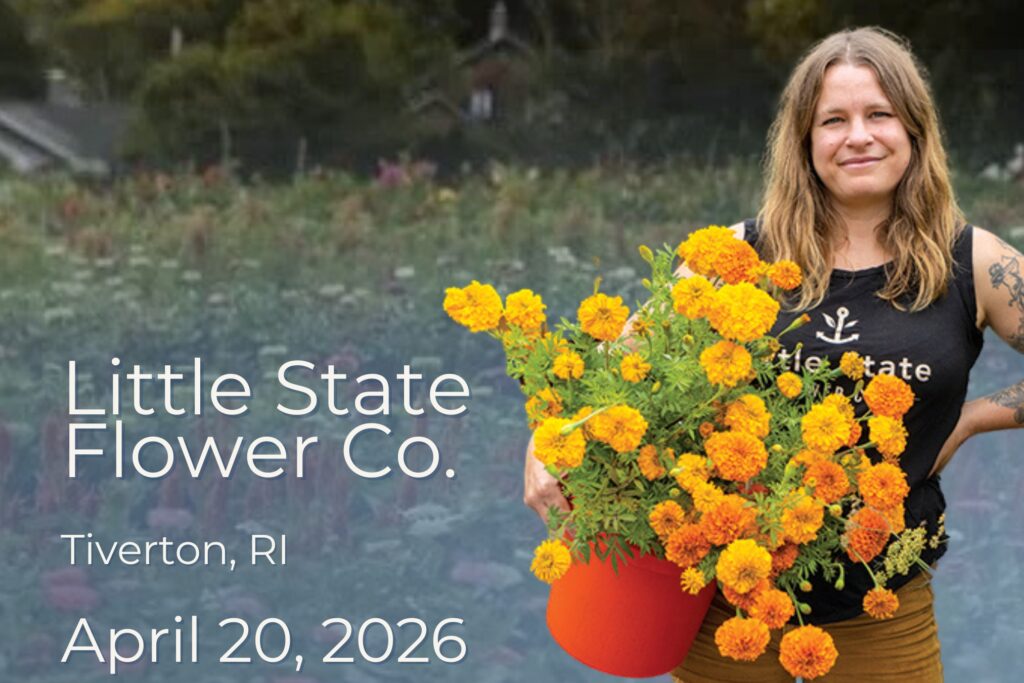 Event Overview: Little State Flower Co. is a five‑acre specialty cut flower farm based in Tiverton, Rhode Island, dedicated to sustainable, locally grown blooms tailored for weddings, events and committed floral designers. Anna Jane Kocon and Bradley Fesmire emphasize reducing the environmental footprint of imported flowers by focusing on seasonal New England‑varieties and serving the community with ethical growing practices. Anna Jane will lead attendees through an overview of the growing practices on the farm with Bradley will cover the farm’s infrastructure and maintenance, among other details. The afternoon will include a floral design demo with Jill Rizzo of Wild Season Florals