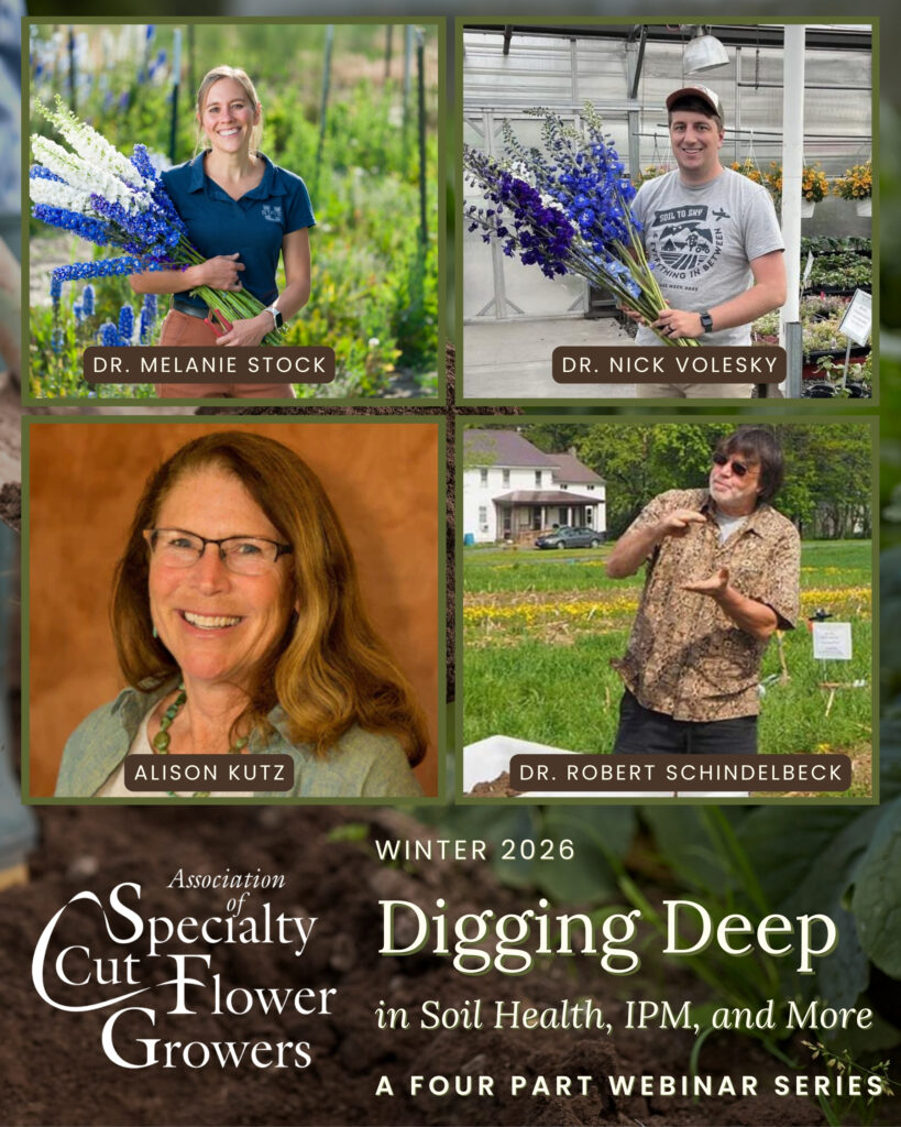 Digging Deep: IPM, Soil Health, and More is a deep dive into soil health, IPM, and other expertise cut flower farmers need when growing their business. This series features 60-minute, Zoom-based presentations given by various experts, and is tailored specifically to address the needs of cut flower farmers.